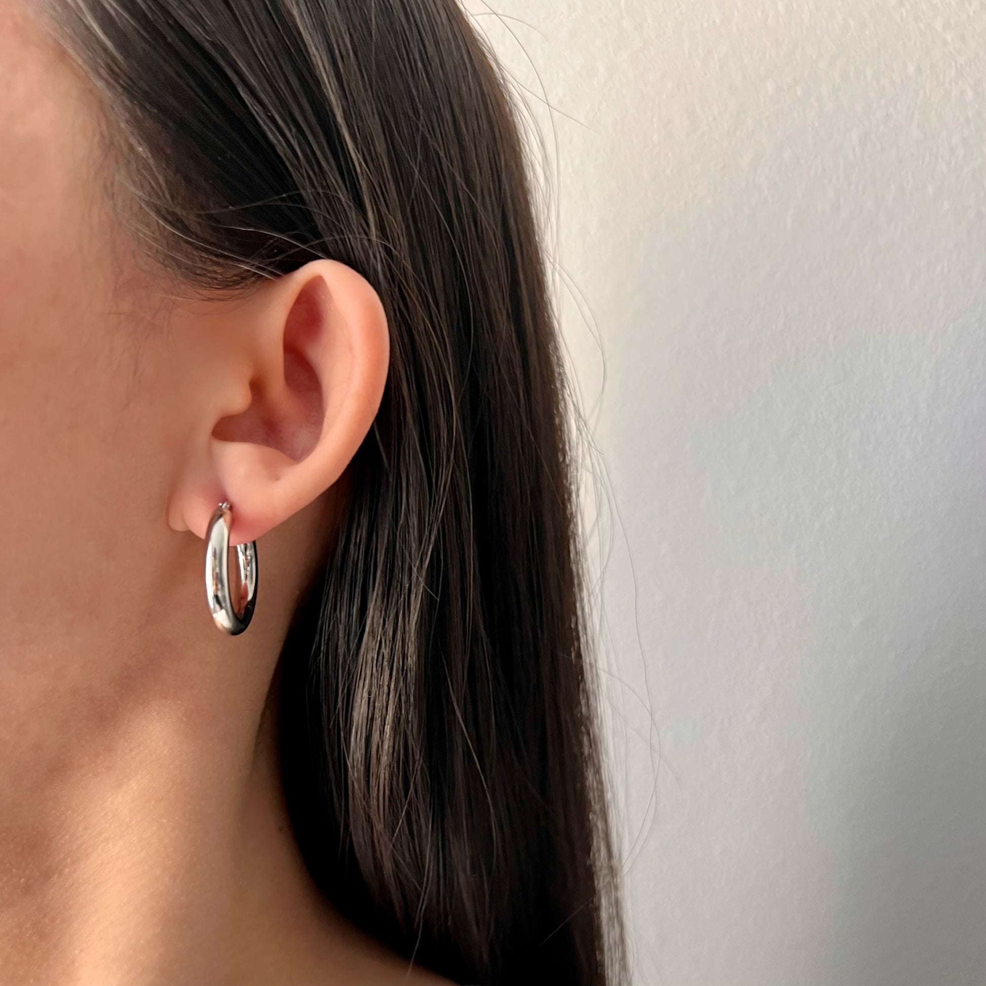 A must have for the summer, the Karli Hoop Earrings are 6MM thick hoops sold as a pair. These sassy and sweet stunners will give you the energy you need to dominate the business meetings by day and summer parties by night. Available in White Gold and Yellow Gold.