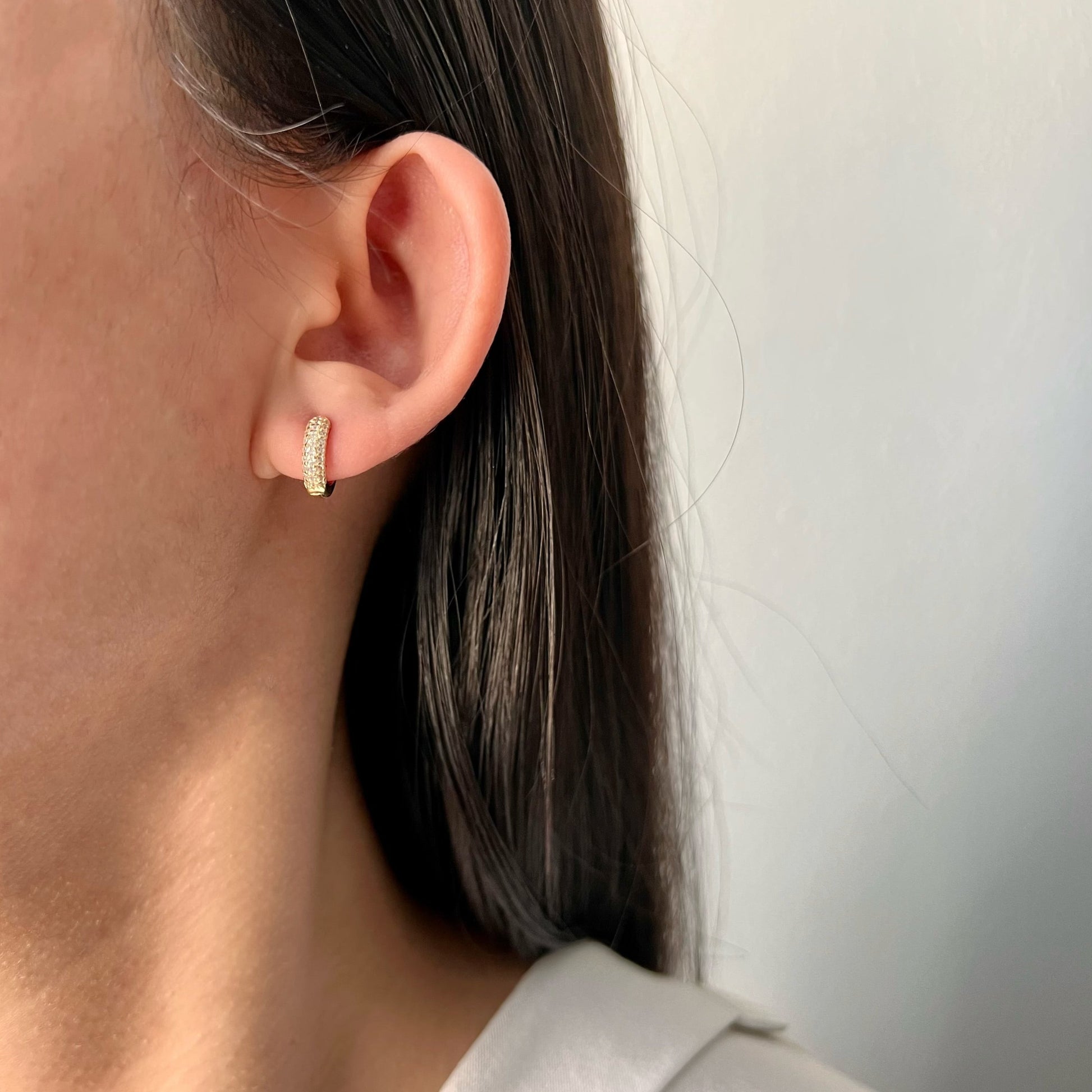These delicately pave-diamond studded huggies add a sweet sparkle to your outfit. Wear alone or stacked in your second hole for an added sparkle! Sold as a pair. Available in Yellow Gold.